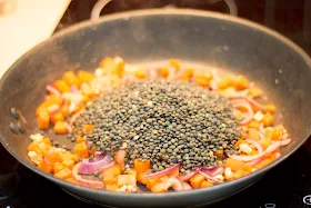 Na oleji opečeme osolené a opepřené maso z obou stran. Vyjmeme a ve výpeku opečeme cibuli a zeleninu, po chvíli přidáme česnek, krátce orestujeme a vsypeme čočku. Zalijeme vývarem, vrátíme opečené maso a pod poklicí dusíme asi půl hodiny. Poté odklopíme a vaříme další čtvrt hodinu, až se většina vývaru vstřebá a čočka bude měkká.